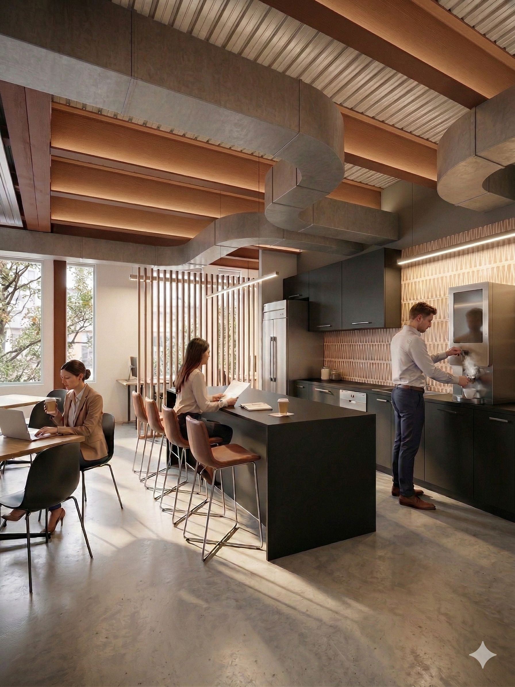 Exposed concrete floors, semi‑rusted steel beams, and polished composite decking overhead provided Ellipsis with a perfect blank canvas for a modern, industrial‑inspired office. A warm material palette balances the coolness of the architecture, introducing a more homey feel while framing extraordinary views of Lake Union and downtown Seattle to the south, and the lively Burke‑Gilman Trail just outside the windows to the north.