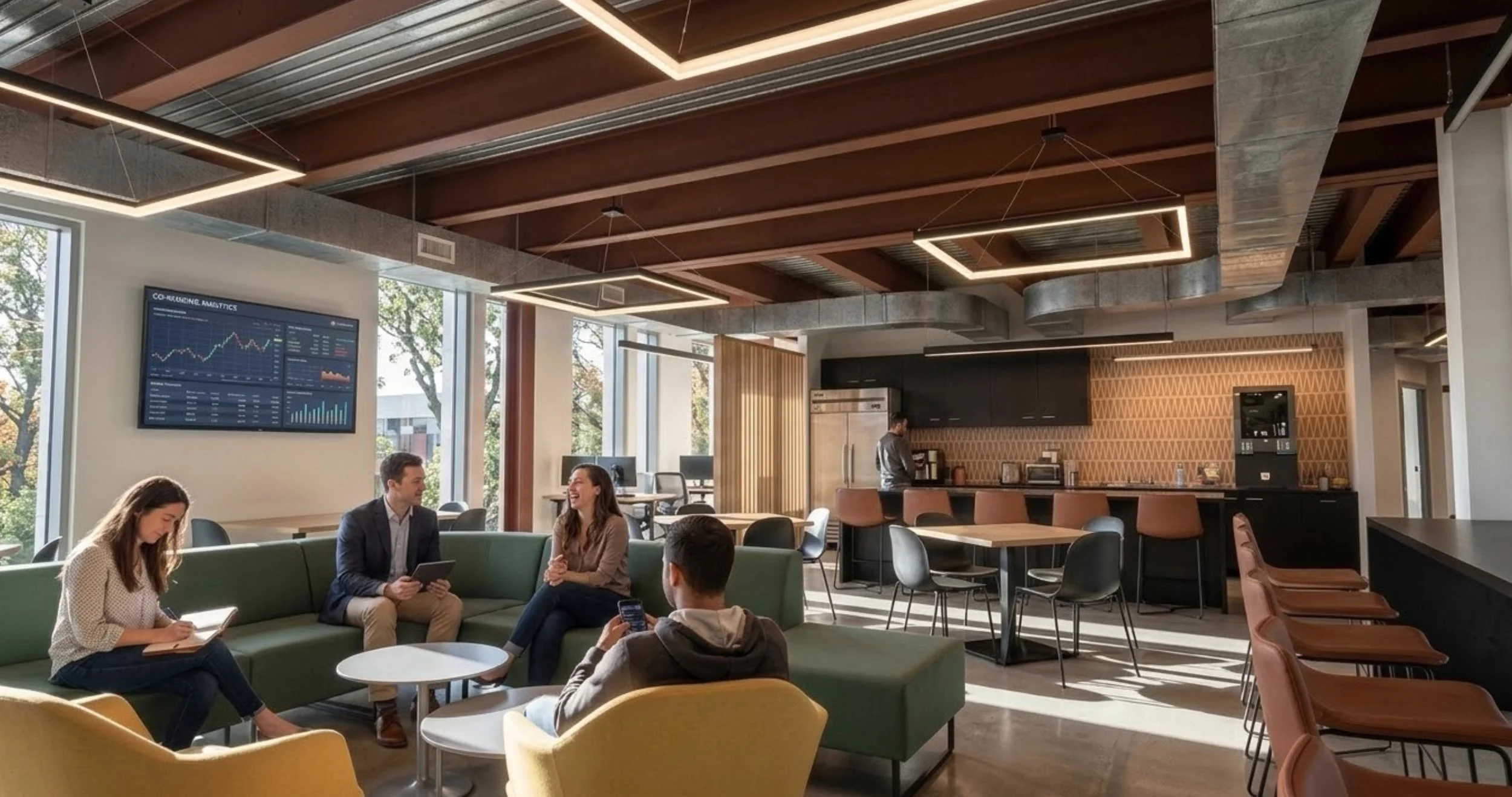 A key feature of the new office is the Community Hub, designed for daily collaborative work, informal meetings, and monthly all‑staff sales sessions. A chat room anchors the glassy corner of the building, creating the sensation of floating above Lake Union during team conversations or virtual meetings. Shared enclosed offices give brokerage teams both privacy and opportunities for close collaboration.